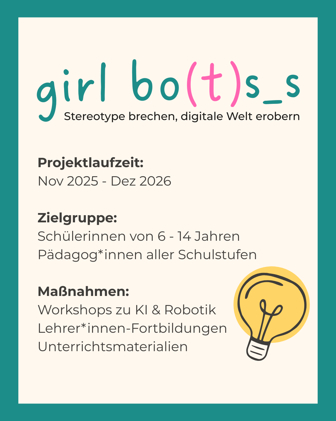 Girl Bo(t)s_s richtet sich an junge Mädchen im Alter von 6 bis 14 Jahren und will in ihnen eine Begeisterung für MINT-Themen wecken. So wollen wir mit Geschlechterstereotypen brechen und spielerisch Selbstbewusstsein im Umgang mit Technik schaffen. Ein besonderer Fokus liegt außerdem auf inklusiver Pädagogik, die wir durch Storytelling und haptische Elemente unterstützen möchten.